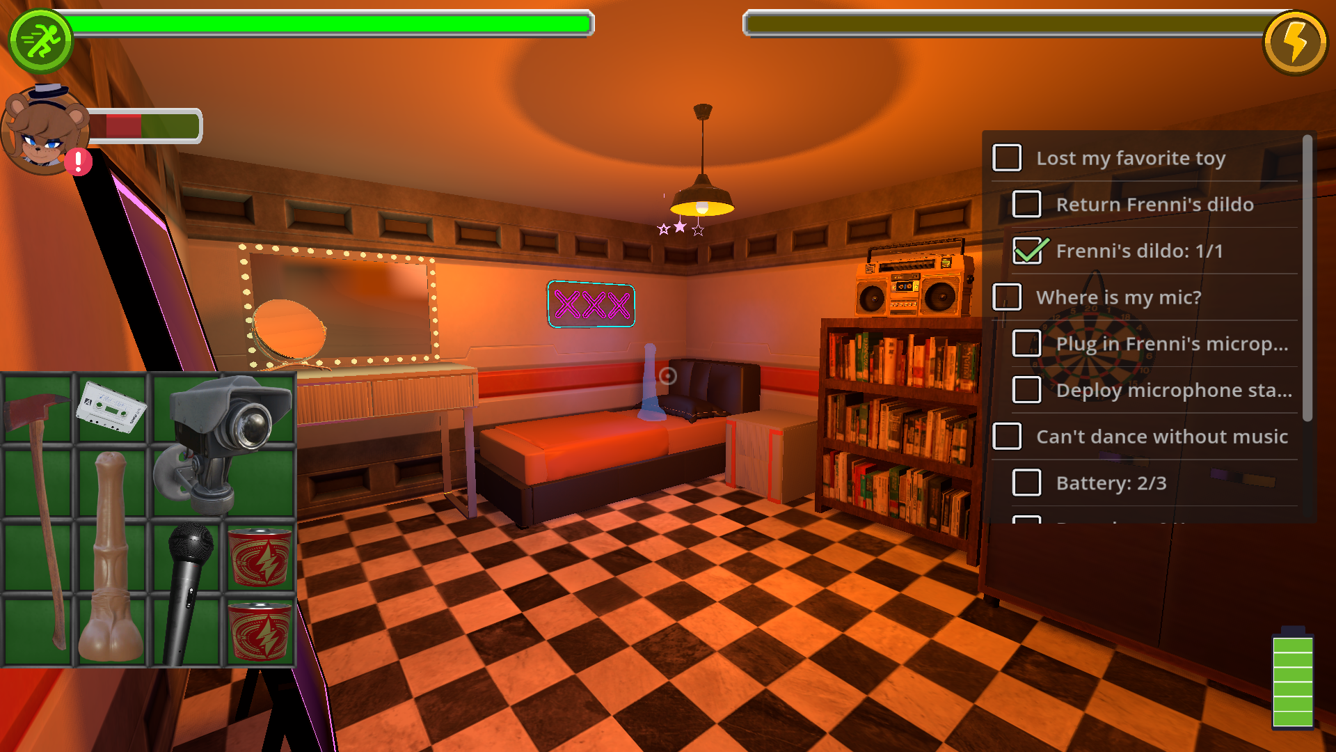 Okay. So, it seems pretty cool so far, but some things really need to change. By far the worst one is how items will sometimes just disappear when you try to use them without counting as being used, meaning you're fucked. Gasoline not refilling, speakers not fixing, batteries not recharging, keycard not opening the kitchen etc. In some cases, going to the menu didn't even fix it, so I had to close the game and restart for it to work again. In one case the gas disappeared without filling the generator, but I tried to roll with it and went to pick up an item since losing the gas meant I had space for it, but the game crashed. Power drain should be adjusted. It seems way too fast for how few gas cans there are and how much stuff you need to get done, and getting caught seemed to drain even more power meaning you're better off just restarting. Frenni's vision cone is WAY too far since she'll spot you from the other side of the map instantly; there should probably be some detection buildup. She will also sometimes get stuck in some spots, like the hall to her room and the door to the kitchen. So yeah, the game has problems, but I only found these problems because it was fun enough that I kept playing and am writing this so they hopefully get fixed. Also, I do worry it will turn out like Fap Nights at Frenni's Night Club when more animatronics get added. That game gets impossibly difficult when there's more than one girl you have to avoid in such a small map with almost no hiding spots.